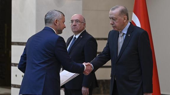 Cumhurbaşkanlığı Külliyesi'ndeki kabulde Belarus Büyükelçisi Anatoly Glaz, Brezilya Büyükelçisi Gilda Motta Santos Neves, Ekvador Büyükelçisi Pedro Vintimilla, Gürcistan Büyükelçisi Archil Kalandia ve Vietnam Büyükelçisi Dang Thi Thu Ha, Başkan Erdoğan'a güven mektuplarını sundu.