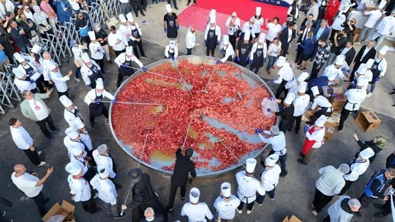 Konuşmaların ardından festivalin en dikkat çeken etkinliklerinden biri olan rekor denemesine geçildi. Kalabalık bir seyirci topluluğu önünde 30 şef tarafından 25 metrekarelik dev tavada 1 ton sucuk ve 15 bin yumurta kullanılarak "dünyanın en büyük sucuklu yumurtası" pişirildi.