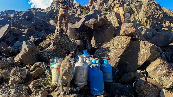 Mağarada, 13 dolu büyük mutfak tüpü, boş küçük tüp, 3 top branda ile 3 top bez kumaş ele geçirildi.