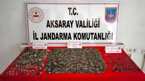 Aksaray'da tarihi eser kaçakçılığına yönelik jandarmanın yaptığı operasyonda, Roma dönemine ait 13 bin 949 sikke, 650 obje ile 110 yüzük ele geçirildi. Olayla ilgili 2 kişi gözaltına alındı.