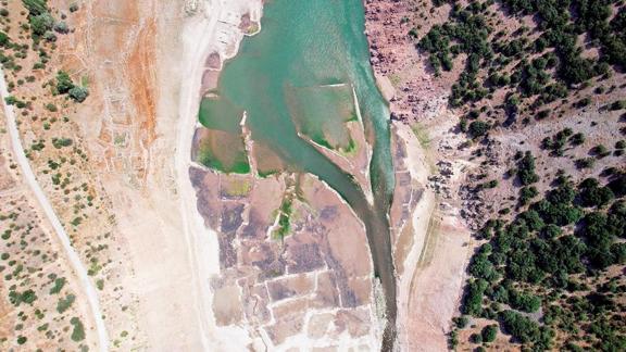 Ankara'nın içme suyu ihtiyacını karşılayan Çamlıdere Barajı'nda, kuraklık nedeniyle su seviyesi kritik seviyelere indi. Baraj sularının büyük oranda çekilmesiyle birlikte, yıllar önce su altında kalan eski bir köy yerleşimi yeniden gün yüzüne çıktı. Kuruyan bölgelerde yol izleri, taş duvar temelleri ve eski yapı kalıntıları net biçimde görünür hale geldi. ASKİ verilerine göre, 2024'te Ankara'daki barajlarda kullanılabilir su hacmi yaklaşık 488 milyon 877 bin metreküp iken, bu rakam 2025'te 170 milyon 669 bin metreküpe geriledi. Kullanılabilir su miktarı yüzde 65'ten fazla azalırken kentteki baraj doluluk oranı yüzde 22,68'e düştü.
