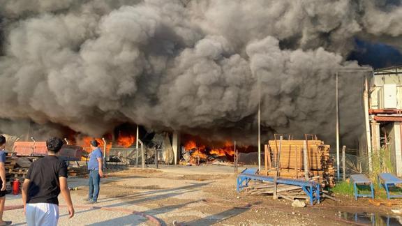 Antalya'nın Serik ilçesinde iki firmaya ait depolarda çıkan yangına itfaiye ekipleri müdahale ediyor.