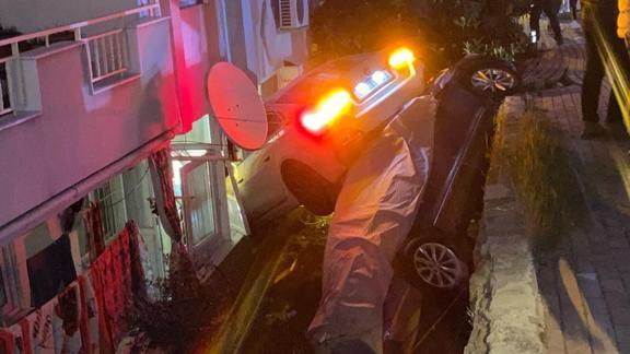 Polis memurunun uyarısının ardından aniden gaza basan sürücünün kullandığı otomobil, önce yakındaki çöp konteynerine ardından park halindeki otomobili de çarparak, yaklaşık 3 metre yükseklikten apartman bahçesine uçtu.