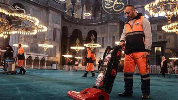 Halılar elektrik süpürgeleriyle süpürüldü, tozu alınan ayakkabılıklara ve caminin içine dezenfektan sıkıldı. Şadırvan, cami avlusu ve Ayasofya meydanı sıcak su ve dezenfektanla yıkandı. Temizlik işlemi sonrası caminin içine ve dışına gül suyu sıkıldı.