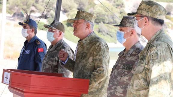 Savunma ve askeri konuların yanı sıra Doğu Akdeniz’deki gelişmelere de değinen Akar, "Her zaman söylediğimiz gibi biz barıştan, diyalogdan, siyasi çözümlerden yanayız. İyi komşuluk ilişkileri ve anlaşmalara, herkesin hukukuna saygılıyız ancak bunun yanı sıra ülkemizin, milletimizin hak alaka ve menfaatlerini korumak ve kollamakta son derece azimli kararlıyız ve buna muktediriz. Ne zamana kadar? Ölünceye kadar. Ölürsem şehit, kalırsam gazi anlayışı ile mücadelemizi sürdürmeye devam edeceğiz." şeklinde konuştu.