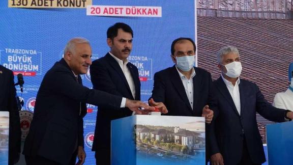 Yüz binlerce projeyi hayata geçirdiklerini söyleyen Bakan Kurum, "Cumhurbaşkanı'mız Sayın Recep Tayyip Erdoğan'ın 2012 yılında kentsel dönüşümü başlatırken verdiği 'Bedeli ne olursa olsun' sözünü yerde bırakmadık. Bugüne kadar 1,5 milyon konutun dönüşümünü milletvekillerimizle belediye başkanlarımızla vatandaşlarımızla hep birlikte başardık. 81 ilimizde, sosyal donatılarıyla beraber 1 milyon bağımsız bölüm ürettik. Toplamda 10 milyon vatandaşımız, bu sağlıklı konutlarda, güven içinde oturuyor. Şimdi 'Türkiye'nin her yerinde kentsel dönüşüm' diyoruz. An itibarıyla ülke genelinde, yatırım değeri 100 milyar lira olan 300 bin sosyal konut ve kentsel dönüşüm konutumuzun inşası için harıl harıl çalışıyoruz. Biz; geçmişle geleceği aynı potada buluşturan, yeşil ile yapıyı kaynaştıran, insan ile şehri bütünleştiren bir şehircilik anlayışına sahibiz. İşte bu anlayışla projelerimizin hepsini yatay mimariye uygun ve Karadeniz yöresinin renklerine uyumlu olarak tasarladık ve uyguladık" dedi.