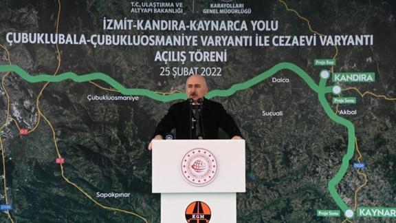 Ulaştırma ve Altyapı Bakanı Adil Karaismailoğlu, İzmit-Kandıra-Kaynarca yolu ile ilgili, "Projenin tamamının hizmete sunulmasıyla güzergahta 1,2 kilometrelik kısalma sağlanacak. Seyahat süresi 60 dakikadan 40 dakikaya indirilecek. Böylece zamandan 84 milyon TL, akaryakıttan 25,2 milyon TL olmak üzere yıllık toplam 109,2 milyon TL tasarruf edilecek, karbon emisyonu 5 bin 356 ton azaltılacak" dedi.