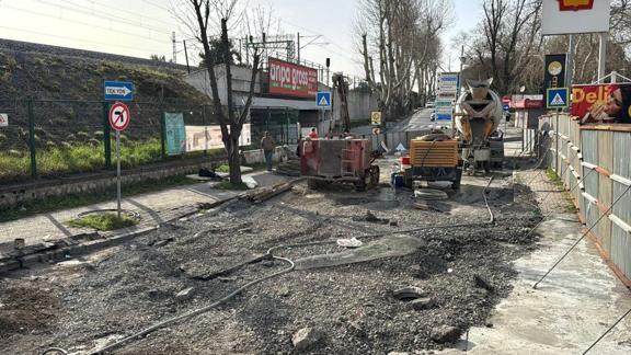Taş blok ve demir bariyerlerle kapatılan sokağa, "Atık su tünel çalışmaları kapsamında yolun altında zemin iyileştirme çalışmaları yapılmaktadır. 31 Mart 2025 tarihine kadar yol geçici olarak trafiğe kapatılmıştır" yazılı tabela asıldı.