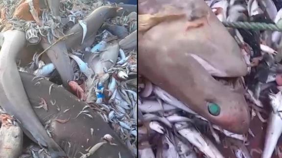 Alınan bilgiye göre, Mersin'in Silifke ilçesinden tekne ile Akdeniz'in 15 mil açığına açılıp trol ağ ile avlanan balıkçılar 8 künt burunlu altı solungaçlı boz camgöz köpekbalığı yakaladı. Köpek balıklarını görünce şaşıran balıkçılar, o anları da cep telefonu ile kaydetti.