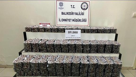 Şüpheli kişinin üzerinde ve adresinde yapılan aramalarda, 89 bin sentetik ecza hapı bulundu.