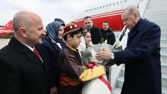 Başkan Erdoğan'ı, havalimanında Adıyaman Valisi Osman Varol'un da aralarında bulunduğu protokol üyeleri ve yöresel kıyafetli çocuklar karşıladı.
