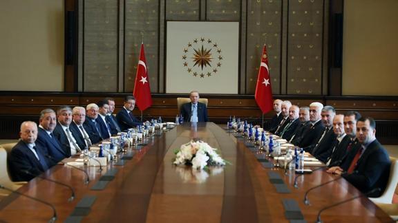 Başkan Erdoğan, 14 Mayıs Dünya Çiftçiler Günü dolayısıyla Tarım ve Orman Bakanı İbrahim Yumaklı, Türkiye Ziraat Odaları Birliği (TZOB) Genel Başkanı Şemsi Bayraktar ve üyelerinin de yer aldığı heyetle Cumhurbaşkanlığı Külliyesi'nde bir araya geldi.