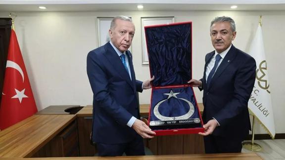 Akkoyun, Erdoğan'a telkari işlemeli gümüş Ay Yıldız plaket takdim etti.