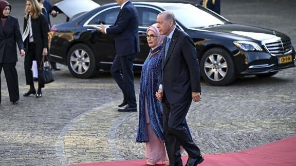 Başkan Erdoğan'a, Kraliyet Sarayı'ndaki yemekte, eşi Emine Erdoğan eşlik etti.