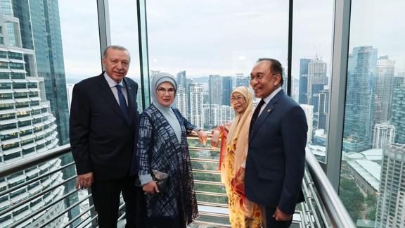 Başkan Erdoğan ve eşi Emine Erdoğan, resmi temaslarda bulunmak üzere geldiği Malezya'nın başkenti Kuala Lumpur'da, Malezya Başbakanı Enver İbrahim ve eşi Dr. Wan Azizah İsmail ile Petronas İkiz Kuleleri'ni ziyaret etti.