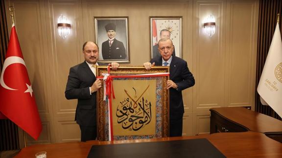 Basına kapalı gerçekleşen kabulde, Gülpınar, Başkan Erdoğan'a "Allah'tan başka ezeli, ebedi bir varlık ve hakikat yoktur" yazılı hat tablo hediye etti.
