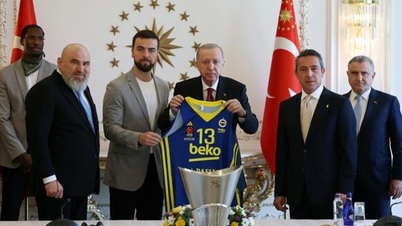 Vahdettin Köşkü'ndeki kabulde, Fenerbahçe Kulübü Başkanı Ali Koç, basketbolcular ve teknik heyeti tebrik eden Başkan Erdoğan, takımla fotoğraf çektirdi.
