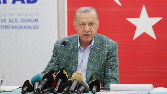 Orman yangınlarından etkilenen bölgelerin "Genel Hayata Etkili Afet Bölgesi" ilan edildiğini hatırlatan Erdoğan, böylece tarım, hayvancılık ve sera faaliyetlerinin hasarlarının karşılanacağını, yanan ve hasar gören evlere öncelikle 50 bin liraya kadar eşya yardımı yapılacağını söyledi.