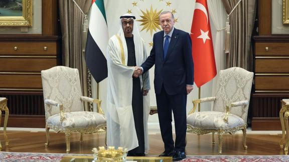 "Daha 3 yıl öncesine kadar, 'ticaret hacminde 10 milyar dolara ulaşır mıyız?' diye hesap yaparken bu yıl 20 milyar doları aşmayı temenni ediyoruz. Orta vadeli hedefimiz olan 40 milyar dolara da her iki tarafın kararlı adımlarıyla ulaşacağımıza inanıyorum. Bu arka plan ışığında değerli kardeşimle az önce verimli bir görüşme gerçekleştirdik. Sadece ikili meseleleri değil Gazze başta olmak üzere Türkiye ve Birleşik Arap Emirlikleri olarak bölgesel meselelerde atabileceğimiz adımları etraflıca değerlendirdik. İmzalayacağımız anlaşmalarla da ilişkilerimizi daha ileriye taşıyacağız. Rabb'im yar ve yardımcımız olsun diyor, kıymetli kardeşime iş birliğimize yaptığı katkılar için bu vesileyle bir kez daha teşekkür ediyorum."