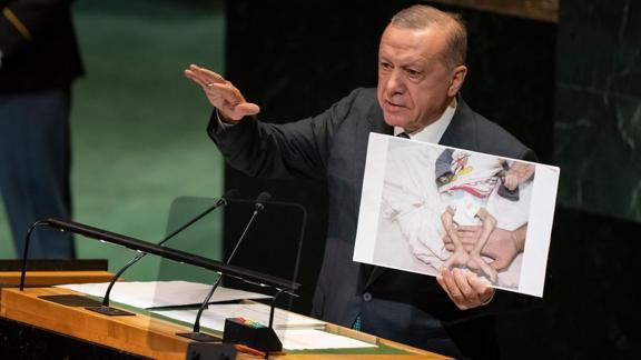 Ardından, açlıktan ölme noktasına gelen bir çocuğun fotoğrafını gösteren Erdoğan, "Buna hangi vicdan dayanır, hangi vicdan buna sessiz kalabilir? Çocukların açlıktan, ilaçsızlıktan öldüğü bir dünyada huzur olur mu?" ifadesini kullandı.