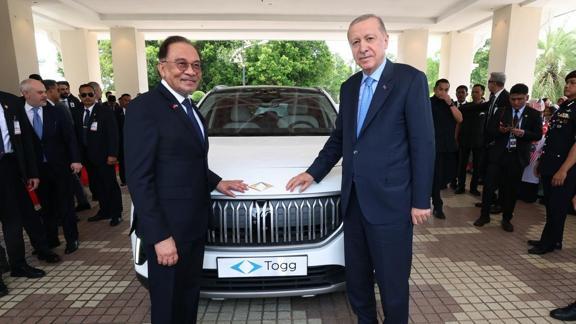 Erdoğan, Togg teslim törenine katılan, ellerinde Malezya ve Türkiye bayrakları bulunan çocuklarla ilgilendi, onlarla fotoğraf çektirdi.