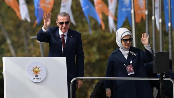 Cumhurbaşkanı Erdoğan, salona gelişinde AK Parti otobüsünün üstünden salon dışında bekleyen binlerce partiliyi selamladı. Erdoğan'a, eşi Emine Erdoğan da eşlik etti.