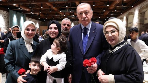 Başkan Erdoğan, sosyal medya hesabından yaptığı paylaşımda, "Her ramazanda olduğu gibi bu yıl da ilk iftarımızı şehit yakınlarımızla birlikte yaptık. Soframızı şereflendirdiği için her bir ailemize teşekkür ediyorum. Milletimizin bize emaneti olan, 81 vilayetimizin tamamındaki şehit yakınlarımızı sevgiyle, saygıyla selamlıyorum." ifadesini kullandı.