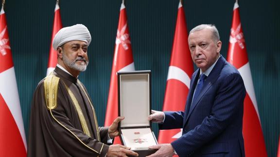 Törende, iki ülkenin milli marşlarının okunmasının ardından Başkan Erdoğan, Umman Sultanı Bin Tarık'a Türkiye Cumhuriyeti Devlet Nişanı tevcih etti.