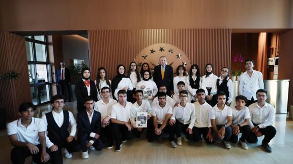 Ahlat Cumhurbaşkanlığı Külliyesi'ndeki kabulde, Türkiye'nin dört bir yanından gelen öğrenciler yer aldı.Milli Eğitim Bakanı Yusuf Tekin'in de bulunduğu kabulde, Erdoğan öğrencilerle sohbet etti ve hatıra fotoğrafı çektirdi.