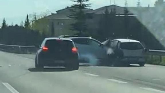 Olay, dün Kocaeli TEM Otoyolu'da meydana geldi. İddiaya göre, içinde bebek ve çocuğun bulunduğu bir otomobil, başka bir araç sürücüsü tarafından defalarca sıkıştırıldı. Ani fren yaparak ve makas atarak ilerleyen sürücü, ailenin bulunduğu otomobili seyir halindeyken tehlikeye soktu. Bir süre böyle devam eden yolculuk sonrasında maganda sürücü, çocuklu ailenin aracıyla birlikte toplam 5 araca çarparak kaza yaptı. O anlar, sıkıştırılan aile tarafından cep telefonu kamerası ile görüntülendi. Görüntülerde araçta bebek ile çocuğun olduğu görülürken, kazaya ilişkin anlar yer aldı.