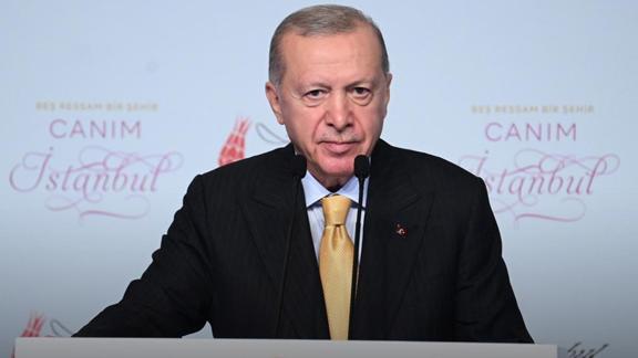 İstanbul'un kutlu fethin ilk günlerinden itibaren tarih ve medeniyet teknesinde yoğurdukları sanat hamurunun mayasını oluşturduğunu dile getiren Erdoğan, "Üstat Necip Fazıl'ın kelimeleriyle ifade edersek denizle toprağın visale erdiği bu aziz şehir, kültür ve sanat hayatımızın en verimli muhitini hatta çoğu zaman membasını teşkil etti. Seçkin ve zengin mimarisiyle, tarihi ve kültürel derinliğiyle İstanbul, sanat eserlerimizin adeta ser levhası olmuştur. Görenleri kendine hayran bırakan bu güzel şehrin sokakları, meydanları, camileri, çeşmeleri, tepeleri ve daha nicesi şiirlerimiz, romanlarımız ve türkülerimizle birlikte tuvallerimizi de süslemiştir. Bütün medeniyetlerin mirası, milletimizin bin yıllık mührüyle mühürlenmiş, burada, İstanbul'da muhafaza altına alınmıştır." diye konuştu.