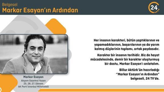 Billur Aktürk'ün hazırladığı 'Markar Esayan'ın Ardından' 24 TV'de sunuldu.