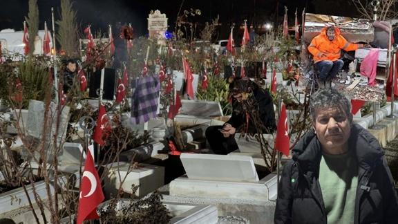 Depremde enkaz altındaki kızının elini tuttuğu fotoğrafla gündeme gelen baba Mesut Hançer de kızının mezarı başına geceden gelenler arasında yer aldı.