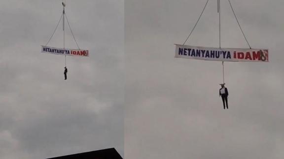 Vatandaşlar, Gazze Kasabı Netanyahu'nun maketini vinçle asıp idam edermişçesine sergiledi.