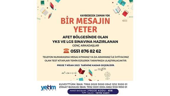 Kahramanmaraş merkezli olarak gerçekleşen depremlerin etkilediği 11 ili kapsayacak şekilde başlatılan kampanyada vakıf, ihtiyacı olan öğrencilere test kitabı ulaştırmayı hedefliyor. Kampanyayı üniversite öğrencilerinin katılımıyla sürdüren Yetim Vakfı, paylaşılan telefon numarası ile olabildiğince çok sayıda depremzede öğrenciye ulaşmayı amaç edinmiş durumda.