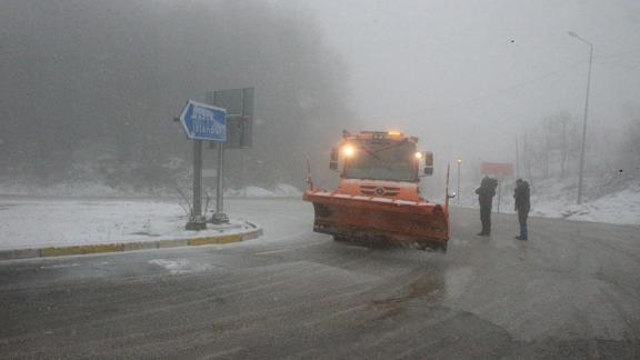 Yağışın ardından kısmen beyaz örtüyle kaplanan ve sisin de hakim olduğu güzergahta Karayolları ekipleri, kar küreme ve tuzlama çalışması yürütüyor.
