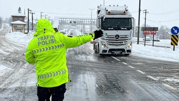 Yoğun kar yağışı nedeniyle ağır tonajlı araçların sürücüleri, buradaki kavşaktan geri döndürüldü.