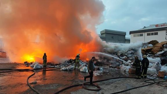 İnegöl Belediyesi'ne ait Ahmet Türkel Çevre Yolu'ndaki endüstriyel atık toplama merkezinde henüz belirlenemeyen bir nedenle başlayan yangın, kısa sürede büyüdü.