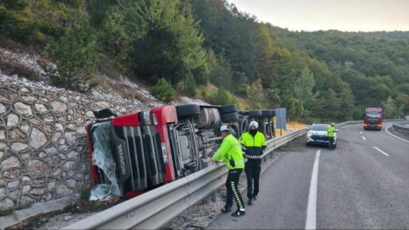 Ahmet S. yönetimindeki 42 ERG 17 plakalı hayvan yemi yüklü tır, Güney Kestane mevkisinde devrildi.