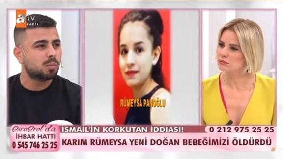 Bebeğin cansız bedeninin nasıl bulunduğunu anlatan Esra Erol, "Doğumdan sonra Rümeysa'nın kanaması olmuş ve hastaneye gitmişler. Başına ne geldiği sorgulandığında doğum yaptığı öğrenilmiş ve bebeğin nerede olduğu sorgulanmış. Eve gelen ekip bebeği poşetin içinde ölü olarak buluyor. Aslında olaylar böyle ortaya çıkıyor" dedi.Rümeysa'nın iki çocuğunu da öldürmesinden korktuğunu söyleyen İsmail Bey, Esra Erol'a daha önce çıkmak istediğini ancak eşinin ailesi tarafından ölümle tehdit edildiğini söyledi.