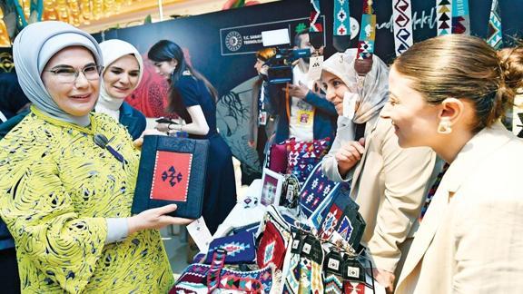 Cemre Çarşısı'nın açılışına katılan Fenerbahçe Kulübü Başkanı Ali Koç, Emine Erdoğan'a Fenerbahçe forması hediye etti.