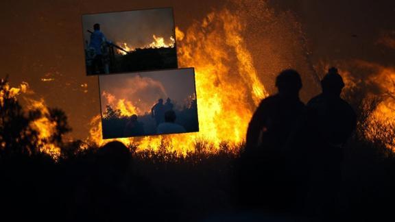 Havanın kararmasıyla ekiplerin karadan müdahalesi sürüyor. Söndürme çalışmalarına vatandaşlar da destek veriyor.