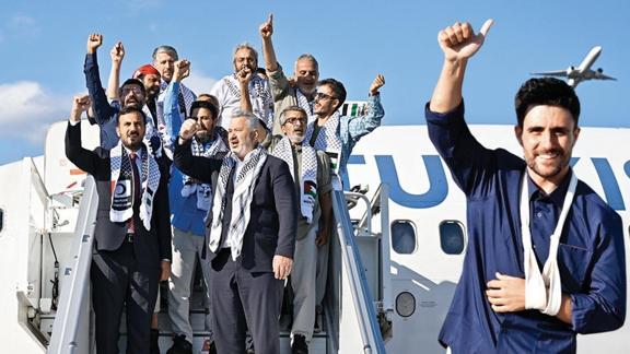 İsrail Gazze'ye insani yardım götüren Küresel Sumud Filosu'na uluslararası sularda saldırmış ve 480 aktivisti zorla esir almıştı. Aralarında Türklerin de bulunduğu cesur yürekler, Ketziot Hapishanesi'ne götürüldü. Dışişleri Bakanlığı'nın girişimiyle 36'sı Türk vatandaşı, 137 filo katılımcısı Türkiye'den gönderilen uçakla İstanbul'a getirildi. Aktivistler, İsrail'in giydirdiği tek tip kıyafetlerini uçağın içerisinde değiştirdikten sonra "Özgür Filistin" sloganı atarak uçaktan indi.