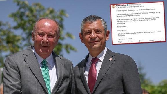 Sosyal medya hesabından açıklamada bulunan Özkiraz, İnce'ye yönelik, "CHP'nin PKK ile yavşak bir ilişkisi var" diyen, En kritik seçimde "üçüncü yolu" açıp yolun ucunu saraya çeviren, İkinci turda 0.40 oyuna bile kıyamayarak "Kılıçdaroğlu'na destek vermeyi" redderek oyları Erdoğan'a yönlendiren, Kent uzlaşısını "pkk ile işbirliği" diye anlatarak belediyelere kayyum ve başkanların tutuklanmasının yolunu gösteren Muharrem İnce geri dönüyormuş. Mübarek olsun. Ama unutmayın Birine ihanet eden herkese ihanet eder, bir kere ihanet eden, her zaman ihanet eder. Hain her zaman haindir." dedi.
