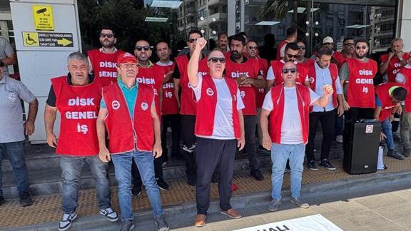 Karşıyaka Belediyesi hizmet binası önünde bir araya gelen Genel-İş üyesi işçiler pankart açtı ve çeşitli sloganlar attı.