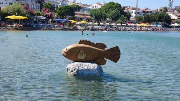 Muğla'nın Datça ilçesinde plaja nesli tehlike altında olan orfoz heykeli yerleştirildi.