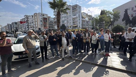 İzmir'in Karşıyaka Belediye binası önünde toplanan memurlar çeşitli sloganlar attı.
