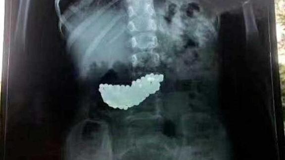 Mıknatıslı olan bilyeler çocuğun midesinde biraraya gelerek büyük bir kitle haline geldi. Bilyeler doğal yollardan çıkmayınca küçük kız 2 ay bu kitleyle yaşadı. Doktorlar rontgenle tespit ettikleri kitleyi ameliyatla çıkardı.