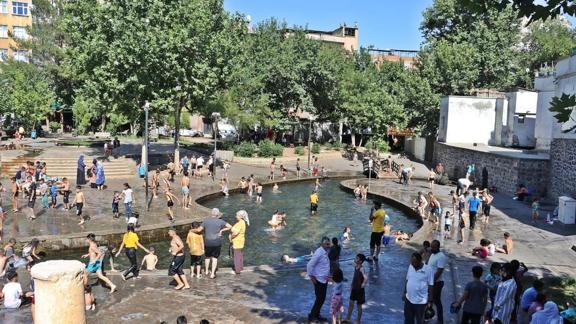 Diyarbakır'da hava sıcaklığının 40 dereceye ulaşmasıyla vatandaşlar soluğu gölgelik alanlarda, sur diplerinde ve parklarda aldı. Bayram tatilindeki çocukların da kimi ebeveynleriyle kimi arkadaşlarıyla, kentin sembollerinden biri olan Sur ilçesinde bulunan Anzele Parkı'na gelerek içerisindeki süs havuzunda serinledi. Ebeveynleri de havuz kenarında bulunan ağaçların gölgesinde oturarak çocuklarını izledi.
