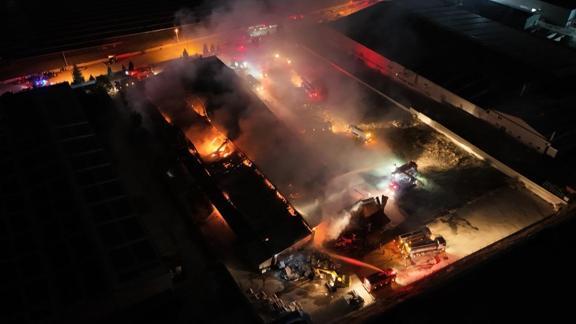 Öte yandan yanan fabrika dronla havadan görüntülendi.